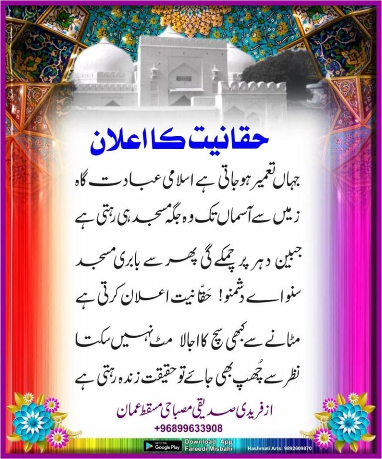 حقّانیت کا اعلان فروری 16, 2022 جہاں تعمیر ہوجاتی ہے اسلامی عبادت گاہ زمیں سے آسماں تک وہ جگہ مسجد ہی رہتی ہے جبینِ دہر پر چمکے گی پھر سے بابری مسجد سنو اے دشمنو ! حَقّانیت اعلان کرتی ہے مٹانے سے کبھی سچ کا اجالا مٹ نہیں سکتا نظر سے چُھپ بھی جائے تو حقیقت زندہ رہتی ہے