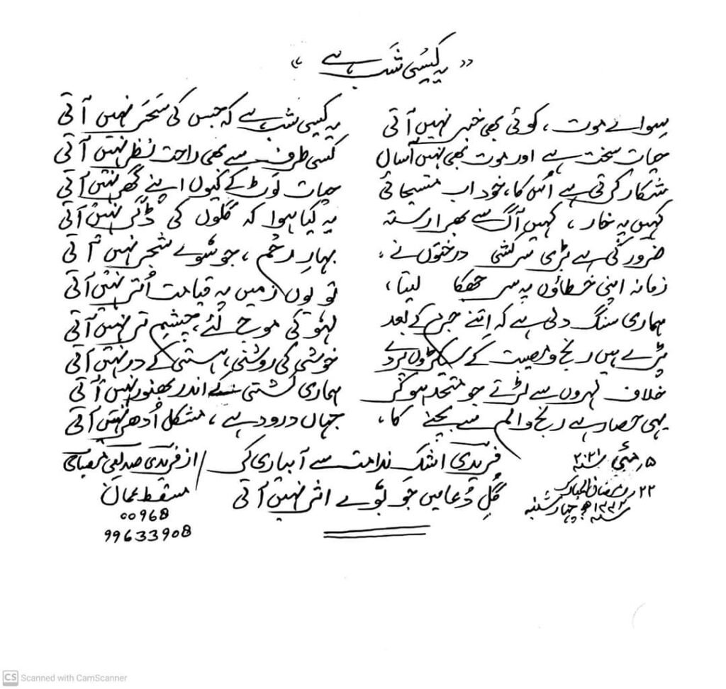 ہمارے نعروں کی آہٹ سے جھوٹ کا شیشہ گرا زمین پہ اور ہوکے چٗور ،، ٹوٹ گیا اُڑی اُڑی سی […]